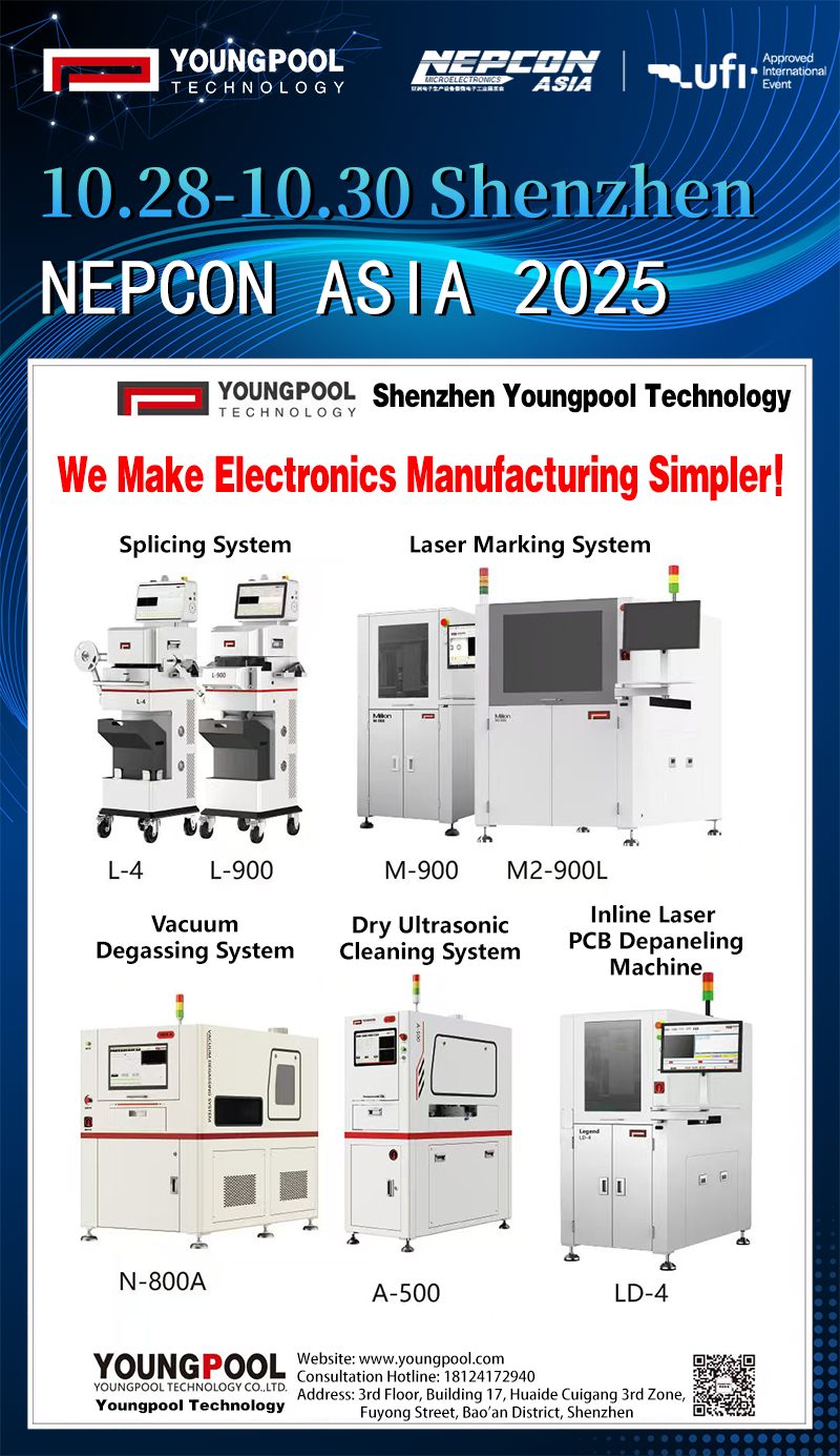 As the electronics manufacturing industry continues to advance toward greater intelligence and precision, NEPCON ASIA, one of the most influential professional exhibitions in Asia, remains a vital platform for industry professionals to gain insights, exchange ideas, and foster collaboration.From October 28–30, 2025, NEPCON ASIA will be grandly held at the Shenzhen World Exhibition & Convention Center (Bao’an). As a trusted equipment and solutions provider with 20 years of deep expertise in the SMT industry, Youngpool Technology will showcase a wide range of innovative, self-developed equipment, joining hands with industry peers to explore the future of electronic manufacturing.