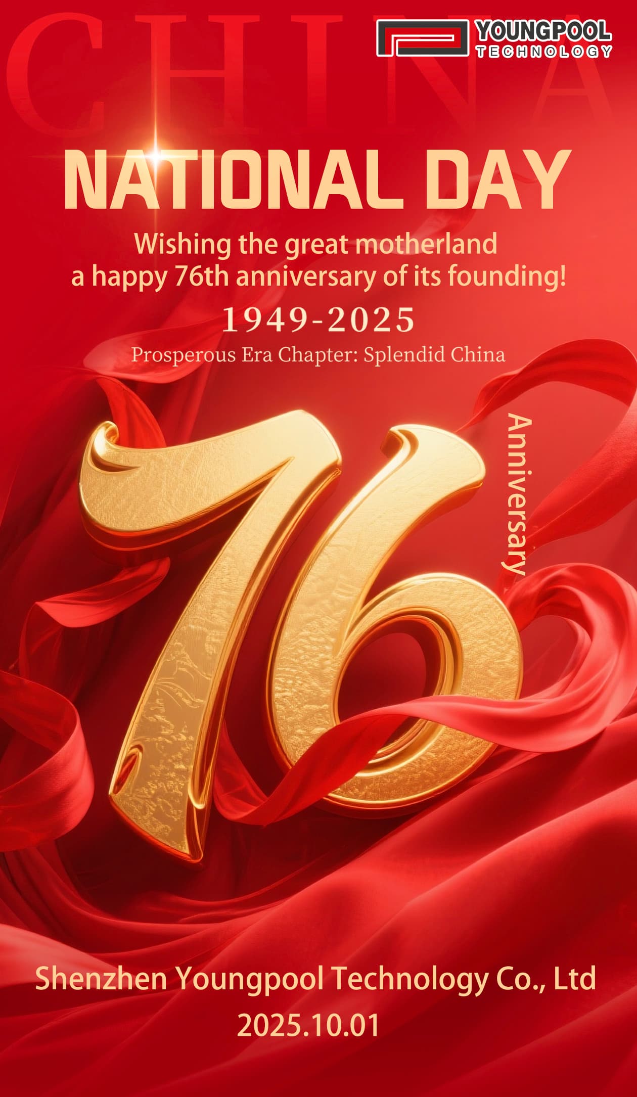 Oct 01, 2025ستة وسبعون عامًا من الرحلة الشاقة، ستة وسبعون عامًا من الإنجازات المزدهرة. في هذه اللحظة المجيدة التي تُصادف الذكرى السادسة والسبعين لتأسيس جمهورية الصين الشعبية، يُحيي جميع موظفي تكنولوجيا يونغبول نعرب عن أسمى آيات الاحترام وأصدق بركاتنا لـ وطننا العظيم بكل فخر!